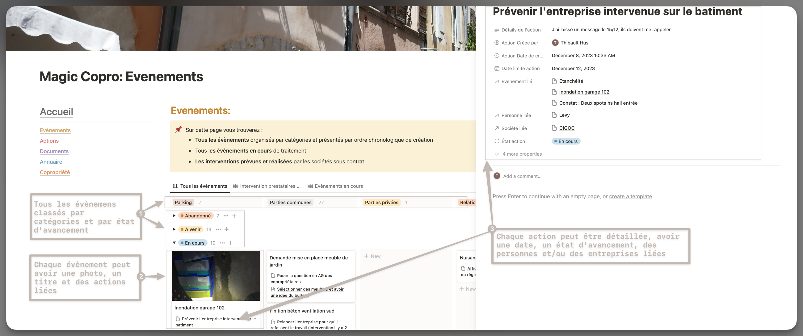 Evènements : Pour organiser et traiter de manière efficace tous les types d'évènements qui arrivent dans une copropriété