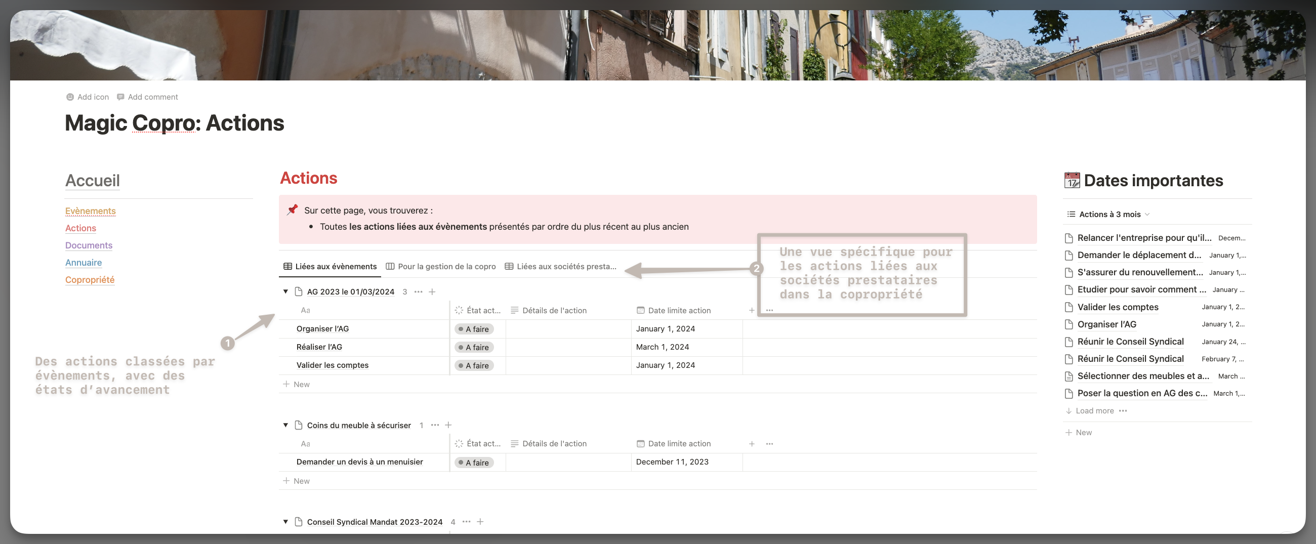 - Actions : Pour organiser et toujours savoir le "qui fait quoi quand" et ainsi faire avancer le bon traitement de tous évènements mais également permettrent d'anticiper toutes les futures importantes échéance de copropriété (AG, fin de garanties constructeurs, renouvellement de contrats de prestations...).