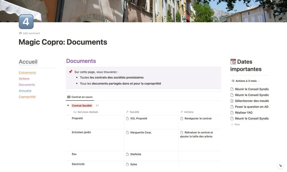 - Documents : Pour centraliser sur seule page et ainsi rendre efficace la recherche d'informations sur tous les documents importants, comme les règlements de copropriété, les procès-verbaux des assemblées, les contrats de service, etc...